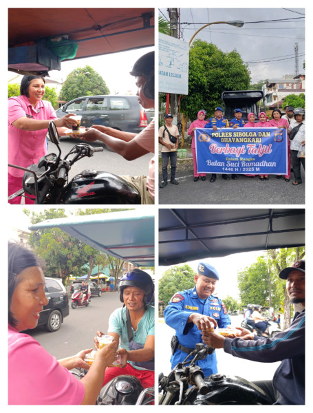 Dalam rangka kegiatan bagi Takjil terlihat Kasat Polairud Polres Sibolga AKP Syahrizal, bersama Anggota Polres Sibolga, serta Bhayangkari Cabang Sibolga, turun langsung membagikan Takjil kepada Warga yang melintas dijalan raya, bertempat di Jalan Dr. Sutomo simpang Jalan Thamrin Sibolga, Kelurahan Kota Baringin, Kecamatan Sibolga Kota, Kota Sibolga. Kegiatan dimulai pada pukul 17.00 WIB hingga selesai. Pembagian Takjil ini ditujukan kepada warga Masyarakat yang kurang mampu, terutama mereka yang tengah berpuasa dan membutuhkan Takjil untuk berbuka puasa.