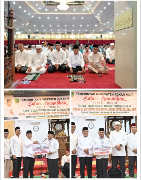 Rohil, indonesiaclik.com || Dalam rangka Safari Ramadhan Pemerintah Kabupaten Rokan Hilir, H. Bistamam dan Jhony Charles bersafari Ramadhan perdana kalinya di Masjid Agung Al-Ikhlas, Bagansiapiapi, Rohil, Provinsi Riau, Kamis (13/2/2025) malam.