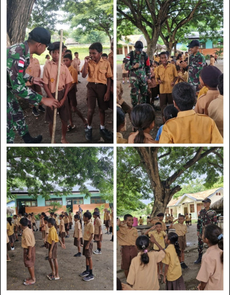 Kegiatan dipimpin oleh Danpos Oepoli Tengah, Sertu C. Popo, bersama lima orang anggota pos. Selain melatih baris-berbaris dan materi dasar kepramukaan, personel Satgas juga menyerahkan bendera Merah Putih sebagai bentuk dukungan semangat kebangsaan bagi para siswa.