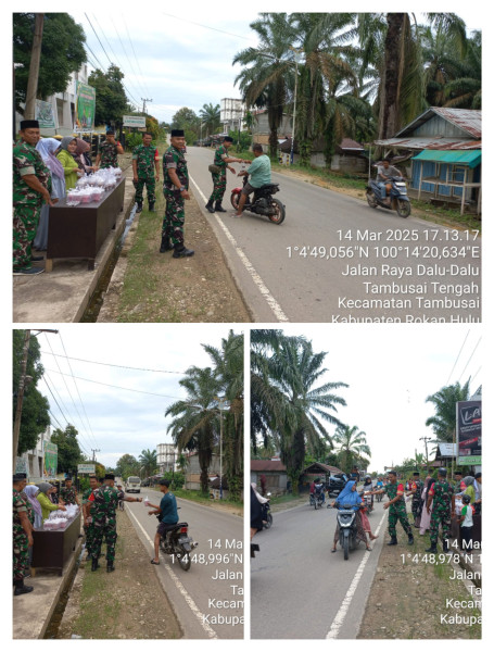 Personil koramil sebelas tambusai menggelar kegiatan bagi bagi takjil kepada masyarakat pengguna jalan di jalan raya dalu dalu tambusai tengah kecamatan tambusai kabupaten Rokan Hulu.senin 17/03/2025