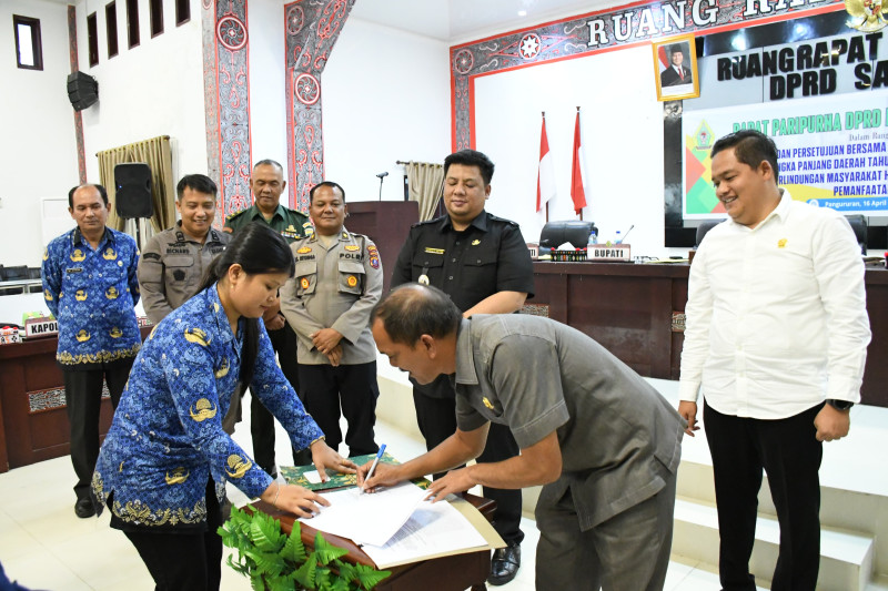 Kesepakatan ini ditandai dengan penandatanganan berita acara persetujuan bersama ranperda oleh Bupati Samosir, Vandiko Timotius Gultom dan unsur Pimpinan DPRD, dalam rapat lanjutan yang digelar di Gedung DPRD Samosir, Komplek Perkantoran Parbaba, Kamis (17/4).