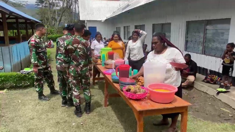 “Terima kasih banyak saya ucapkan kepada bapakbapak TNI sekalian yang sudah membantu menyediakan dan menyiapkan Konsumsi berupa makanan kepada Jemaat Gereja kami. Kami sangat terbantu dengan bantuan dan kehadiran bapak-bapak sekalian, semoga dalam menjalankan tugas disini selalu diberkati Tuhan,” ucapnya.