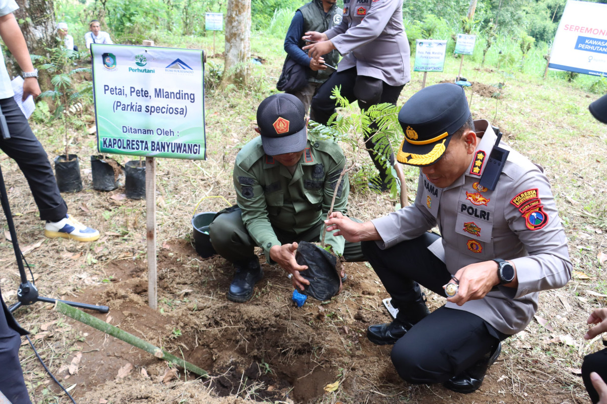 Banyuwangi , indonesiaclik.com ll Kapolresta Banyuwangi Kombes Pol Rama Samtama Putra,S.I.K., M.Si., M.H., bersama jajaran Forkopimda (Forum Komunikasi Pimpinan Daerah) Kabupaten Banyuwangi menghadiri kegiatan “Ceremony Penanaman dan Penghijauan Bersama untuk Konservasi dan Rehabilitasi” yang diselenggarakan oleh PT Bumi Suksesindo (BSI), Sabtu (26/4/2025), di kawasan Agathis Forest, Desa Rembang, Kecamatan Licin.