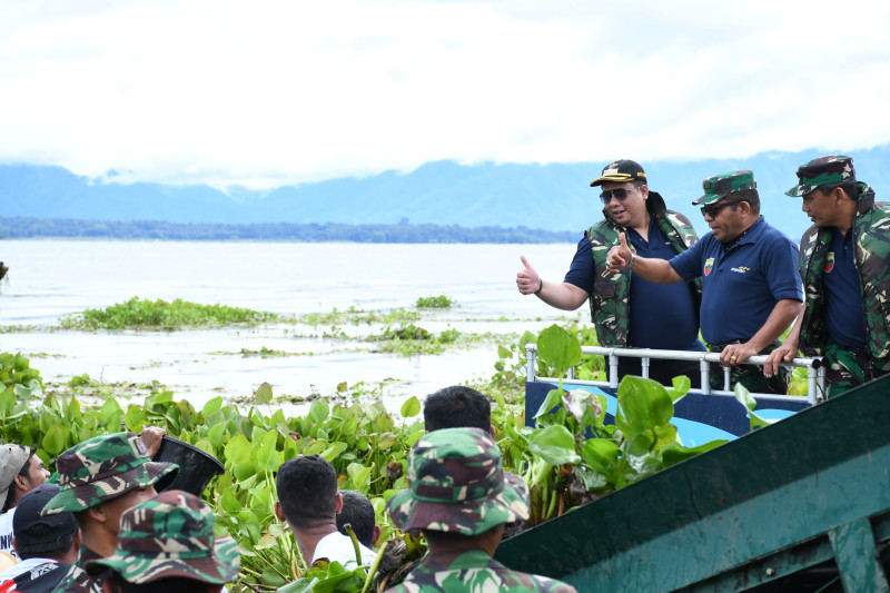 Pada kesempatan tersebut, Mayjen TNI Rio Firdianto bersama rombongan dan seluruh Bupati turut serta membersihkan langsung eceng gondok di perairan Pantai Landai, Desa Lumban Gaol.