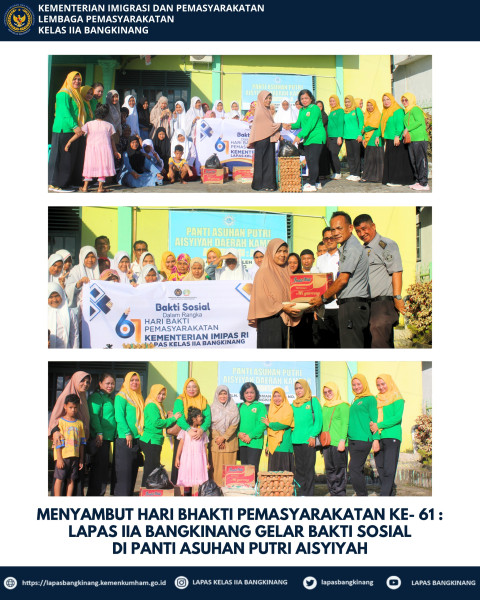 Kegiatan Bakti Sosial ini dipimpin langsung oleh Kepala Sub bagian Tata Usaha, Parlin HS mewakili Kepala Lembaga Pemasyarakatan Kelas IIA Bangkinang, Alexander Lisman Putra bersama Jajaran Pegawai serta DWP Lapas Bangkinang yang turut hadir dalam kegiatan di Panti Asuhan Putri Aisyiyah.
