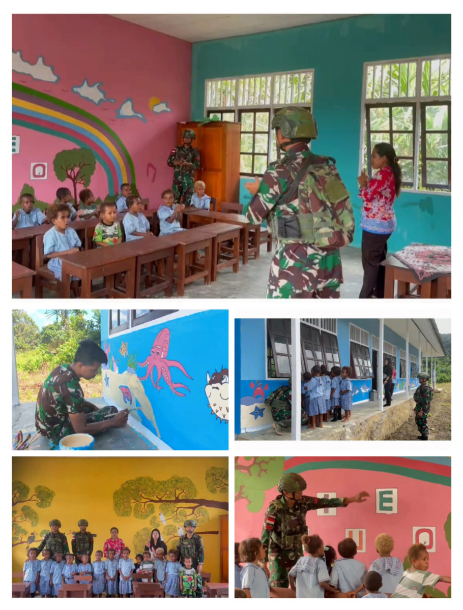 Dataran Beimes , indonesiaclik.com ll Satgas Yonif 642/Kps melalui Pos Dataran Beimes melaksanakan kegiatan karya bakti di Taman Kanak-Kanak Bouden Ruga, Dataran Beimes, Papua Barat. (18/5).