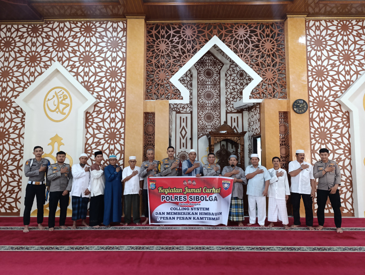 SIBOLGA , indonesiaclik.com ll Kapolres Sibolga AKBP Eddy Inganta, SH, SIK, MH, diwakili Kasat Binmas Polres Sibolga AKP Martua Sinaga bersama Kapolsek Sibolga Sambas IPTU Yuna H. Gultom, SH, MH dan Kanit Tipidter Reskrim Polres Sibolga IPDA Filingga Gardaruna, S.Tr.K, melaksanakan kegiatan Jumat Curhat yang di Masjid Al-Azhar Sibolga, Jalan Sutoyo Siswomiharjo Kelurahan Pasar Baru Kecamatan Sibolga Kota, Kota Sibolga, Jumat (30/05/2025).