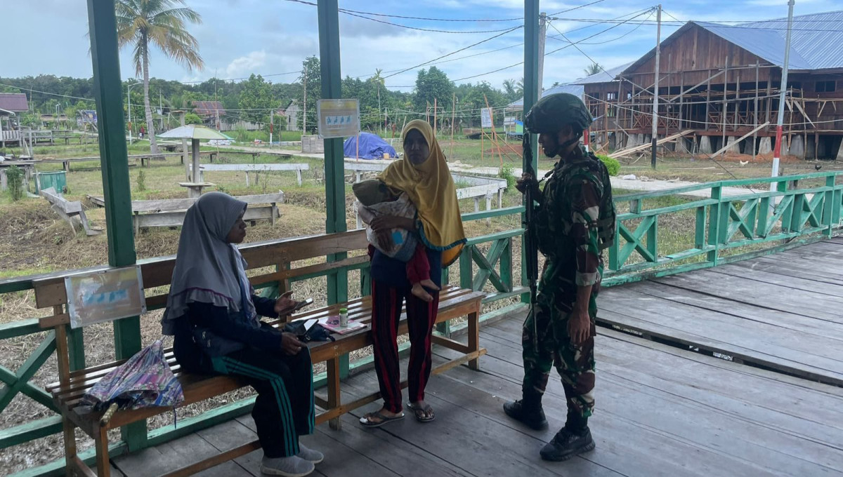 Dalam kegiatan tersebut, salah satu personel Pos Kamundan terlihat berdialog hangat dengan dua orang ibu rumah tangga, salah satunya sedang menggendong anak. Mereka berbincang mengenai layanan kesehatan yang tersedia serta pentingnya menjaga kesehatan keluarga. Suasana penuh keakraban ini mencerminkan komitmen TNI dalam membina hubungan baik dan mendukung kesejahteraan masyarakat di daerah penugasan.