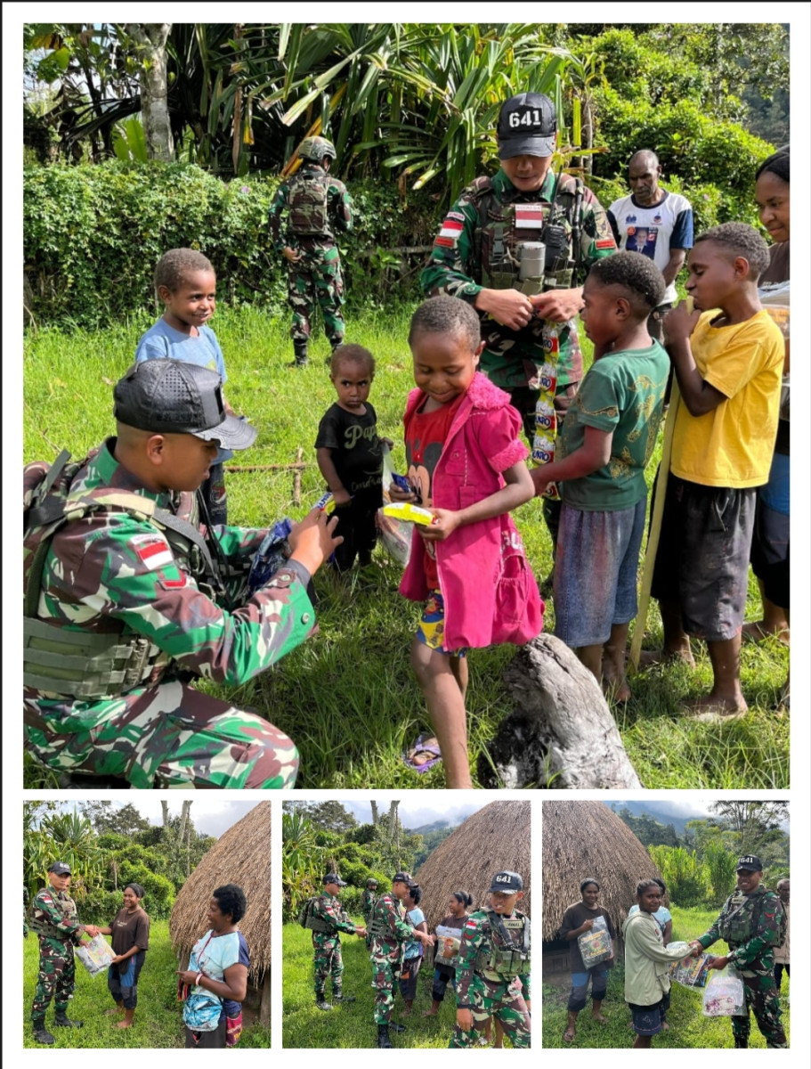 Yahukimo, indonesiaclik.com || Guna mempererat keakraban dan tali silahturahmi dengan masyarakat, Pos Kurima Satgas Pamtas RI-PNG Kewilayahan Yonif 641/Bru melaksanakan Anjangsana dan membagikan baju baru dan sendal kepada anak-anak di Kampung Polimo Distrik Kurima, Kabupaten Yahukimo, Papua Pegunungan (06/05/2025).