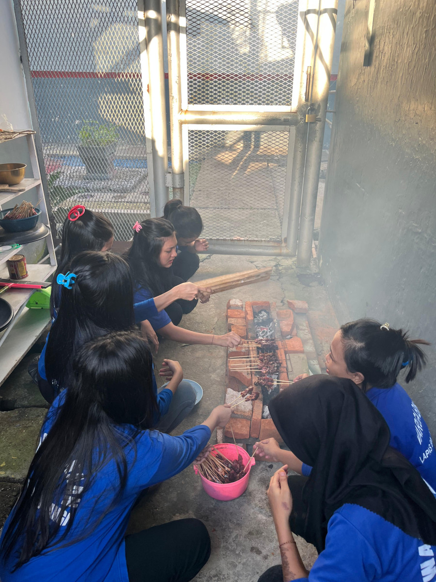 Menggunakan perlengkapan sederhana, Warga Binaan terlihat kompak dalam meyiapkan segala bahan yang dibutuhkan untuk membakar sate yang telah disebar menyeluruh ke setiap kamar hunian.