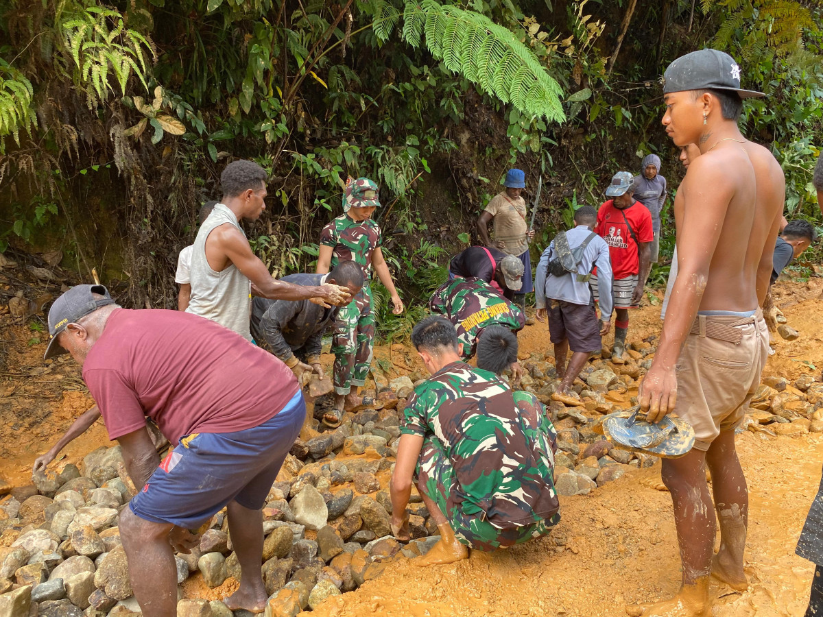 Kaimana , indonesiaclik.com ll Pos Yamor melaksanakan karya bakti memperbaiki jalan utama menuju Kampung Ururu Distrik Yamor Kabupaten Kaimana, Papua Barat, Selasa (03/06/2025).