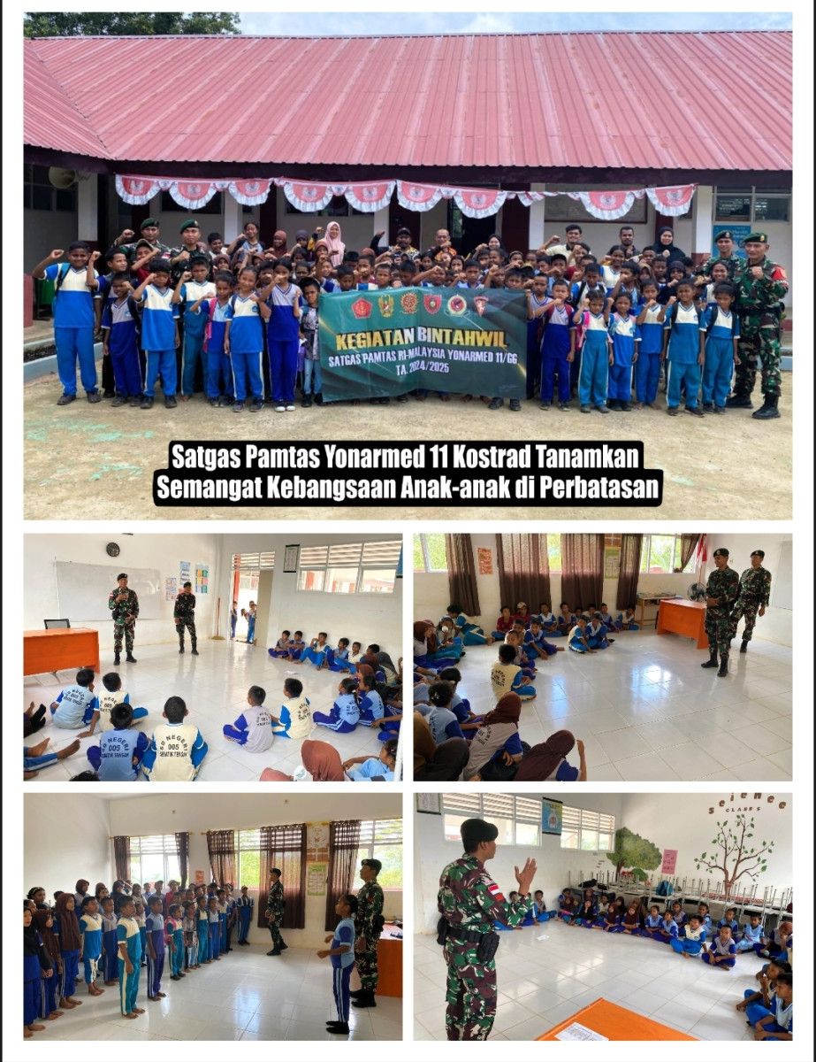 Kegiatan ini menjadi salah satu bentuk nyata kepedulian TNI dalam mendukung dunia pendidikan serta memperkuat nilai kebangsaan di daerah perbatasan RI–Malaysia. (Pen Yonarmed 11/GG)