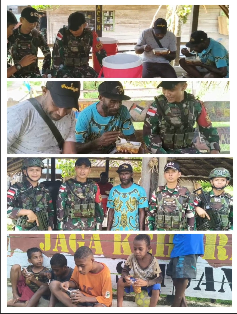 Kaimana, indonesiaclik.com ||  Satgas pamtas kewilayahan Yonif 642/ kps, Pos Teluk Etna melaksanakan kegiatan makan bersama masyarakat dan anak anak di kampung Kiruru, distrik Teluk Etna, Kabupaten Kaimana, Papua Barat.