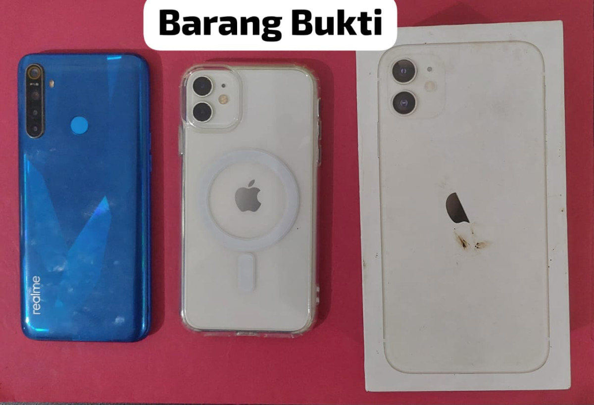Dari tangan para pelaku, pihak kepolisian menyita barang bukti berupa satu unit handphone iPhone 11 warna putih, satu unit handphone merek Realme warna biru, serta satu kotak handphone iPhone 11. Seluruh barang bukti kini telah diamankan untuk proses penyidikan lebih lanjut.