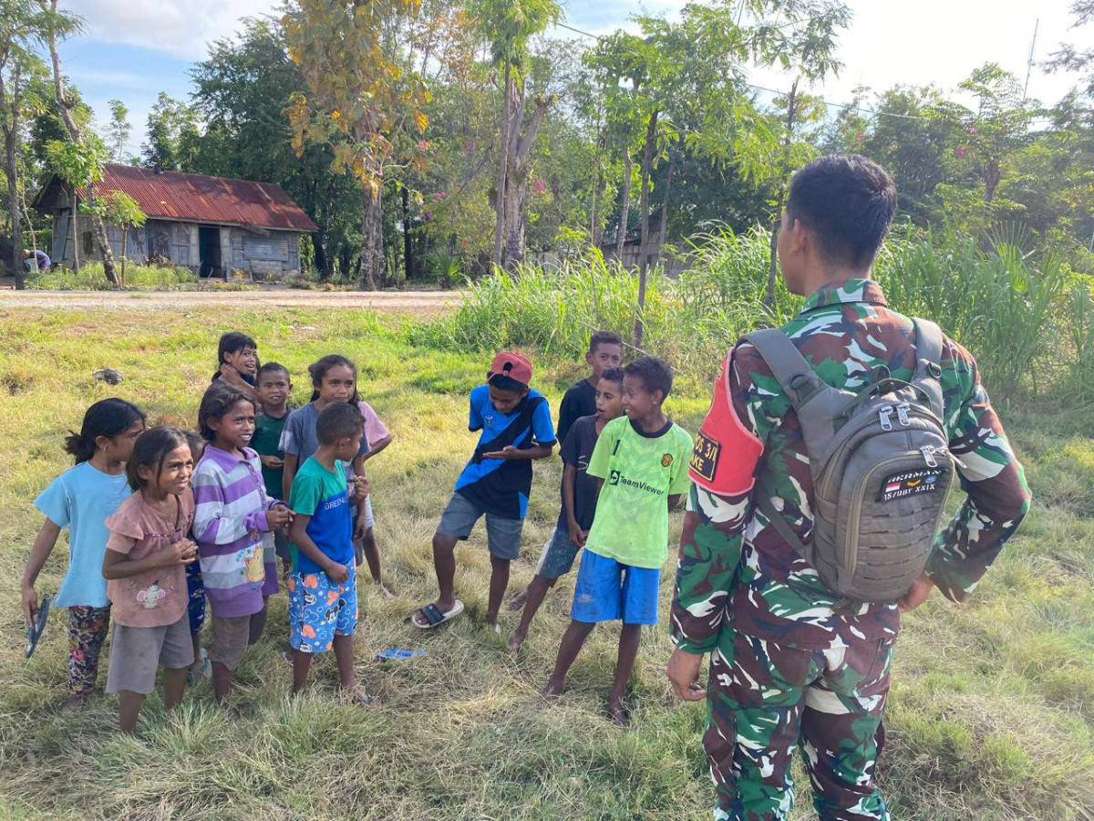 TTU, indonesiaclik.com || Pada Rabu, 11 Juli 2025, Pos Naekake di bawah pimpinan Serda Hermantoro (Wadanpos Naekake) bersama dua anggota pos melaksanakan kegiatan wawasan kebangsaan di lapangan Desa Naekake A, Kecamatan Mutis, Kabupaten Timor Tengah Utara. Kegiatan ini ditujukan kepada anak-anak yang sedang bermain dan berkumpul di area tersebut.