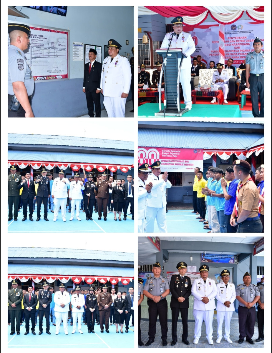 Kominfo Samosir, indonesiaclik.com || Dalam rangka memperingati HUT ke-80 Kemerdekaan Republik Indonesia, Bupati Samosir Vandiko Timotius Gultom, ST secara simbolis menyerahkan Remisi Umum (RU) dan Remisi Dasawarsa (RD) dari Kementerian Imigrasi dan Pemasyarakatan RI kepada 86 warga binaan Lembaga Pemasyarakatan (Lapas) Kelas III Pangururan, Minggu (17/8).