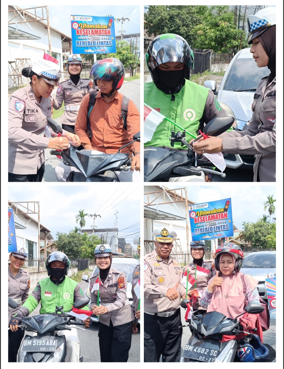 Pekanbaru, indonesiaclik.com || Dalam rangka menyambut Hari Ulang Tahun Republik Indonesia ke-80 tahun 2025, Ditlantas Polda Riau bersama Satlantas jajaran melaksanakan kegiatan pembagian Bendera Merah Putih kepada pengemudi kendaraan bermotor di Jalan Kemuning, Kota Pekanbaru, Jumat (8/8/2025).