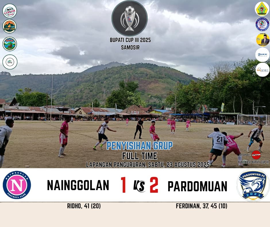 Samosir, indonesiaclik.com ||  Duel sengit tersaji di lapangan Pangururan saat Nainggolan FC berhadapan dengan Pardomuan FC dalam lanjutan Turnamen Bupati Cup III Samosir 2025, Sabtu (23/8/2025). Pertandingan berlangsung panas hingga menit akhir dan diwarnai sejumlah kartu kuning dari kedua tim.