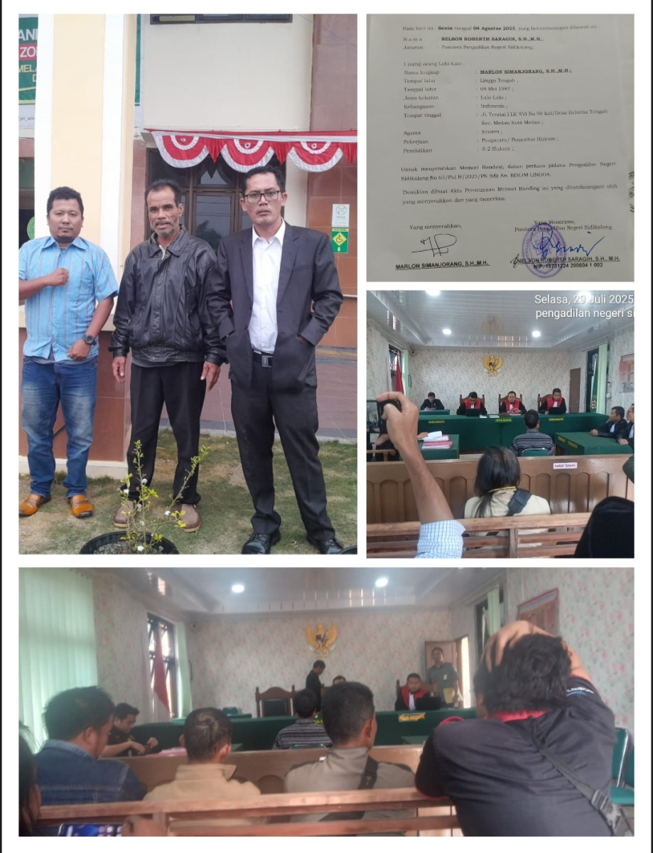 Sidikalang, indonesiaclik.com || 4 Agustus 2025 – Terdakwa dalam perkara pidana ringan atas nama BISLIM LINGGA resmi mengajukan memori banding atas putusan Pengadilan Negeri Sidikalang Nomor: 65/Pid.B/2025/PN Sdk yang dibacakan pada 29 Juli 2025. Banding ini diajukan oleh kuasa hukum terdakwa, Marlon Simanjorang, S.H., M.H., dan telah diterima oleh Panitera PN Sidikalang melalui Akta Penerimaan Memori Banding Nomor: 47/Bdg/Akta.Pid/2025/PN Sdk.