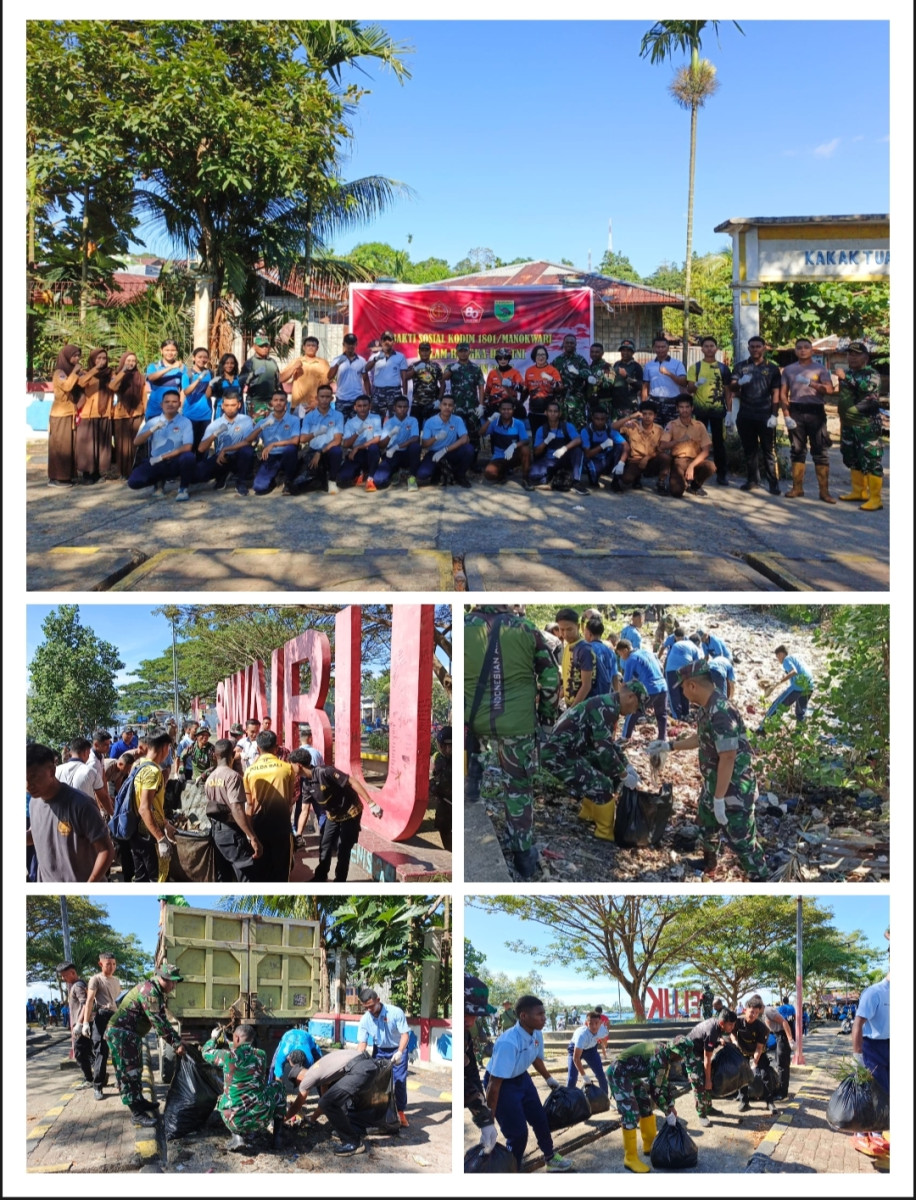Kegiatan yang dipimpin langsung oleh Dandim 1801/Manokwari, Letkol Inf Davit Sutrisno Sirait, S.E., ini melibatkan ratusan personel TNI (Kodim 1801/Manokwari dan Fasharkan TNI AL), Polresta Manokwari, FKPPI, para pelajar dari SMA Taruna, SMA Negeri 1, SMA Yapis, hingga warga masyarakat Wirsi dan Arkuki. Kehadiran semua unsur ini menjadi bukti nyata sinergi TNI-Polri bersama rakyat untuk menjaga lingkungan tetap bersih dan lestari.